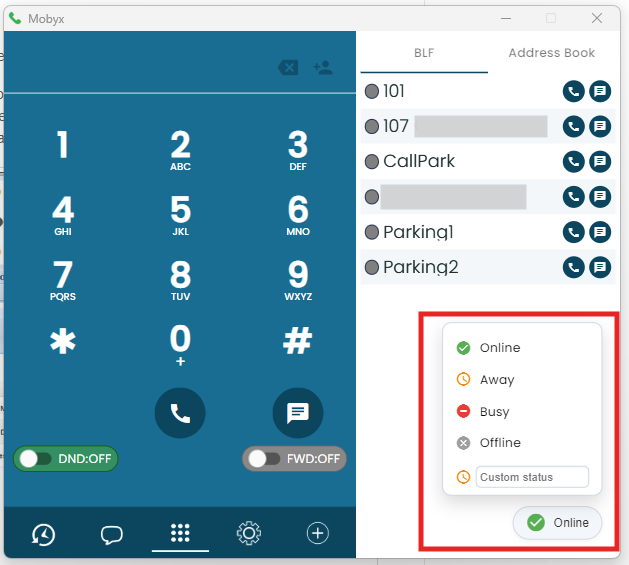 The UsVox Mobyx Desktop Softphone allows users to manually control their availability by setting their status to: