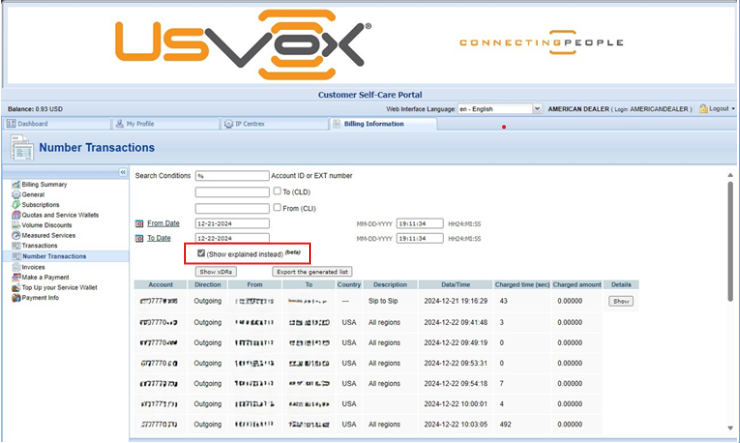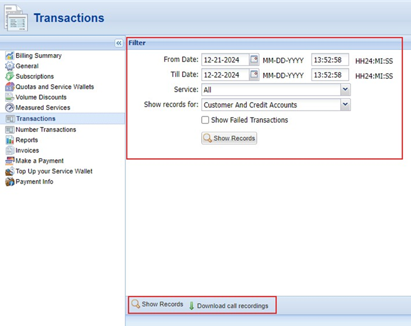 You can view and download detailed call activity through the Transactions page in your Administrator portal.