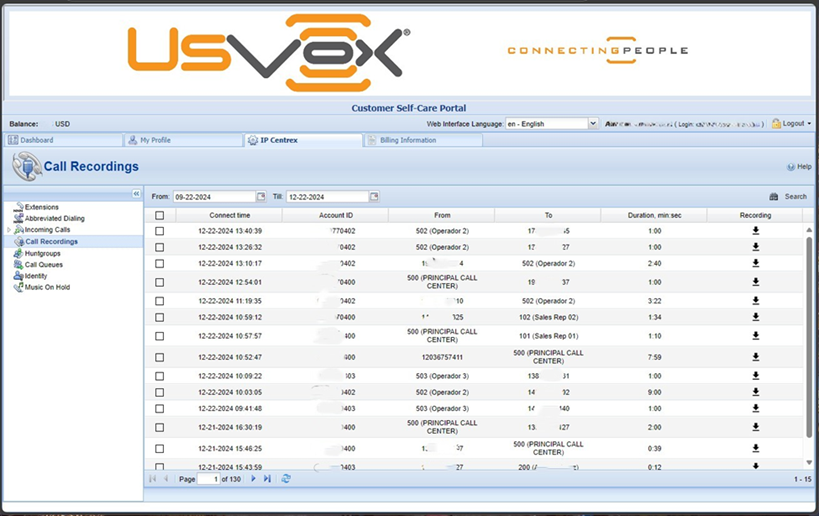 - Go to IP Centrex > Call Recordings to view or download recordings.
