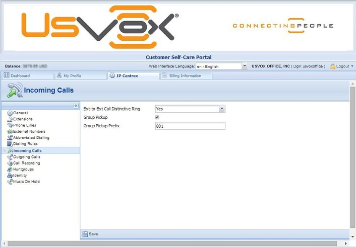 The Incoming Calls settings allow you to customize how your IP Centrex environment handles calls — from using a unique ringtone for internal calls to enabling group pickup.