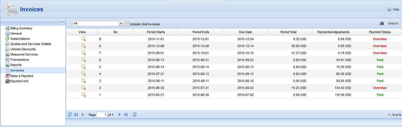 The Invoices page provides a complete list of all your billing statements. Use this page to: